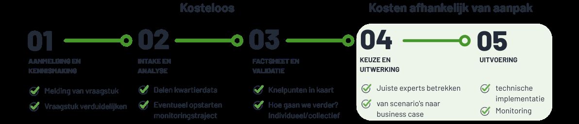- Collectief / voor de meter: verdere verkenning met andere bedrijven, het organiseren van gesprekken op het bedrijventerrein, of een volgende stap richting samenwerking als de screening daar aanleiding toe geeft.