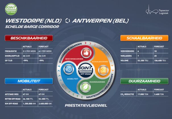 De vaarroute: Schelde Barge Corridor is officieel toegevoegd aan het landelijke programma Joint Corridors Off Road een programma van de Topsector Logistiek. Deze formalisering heeft als gevolg dat de verbinding geoptimaliseerd en opgeschaald kan worden. Frans van den Boomen van de Topsector Logistiek voegt hieraan toe: “Het gaat niet alleen om het bundelen van volume, maar ook om het bundelen van kennis. Door samen te werken kunnen we de balans op maken: wat kan er nóg slimmer, kan deze aanpak ook voor andere regio’s werken of kunnen we de connectie maken met andere Corridors in binnen en buitenland.”